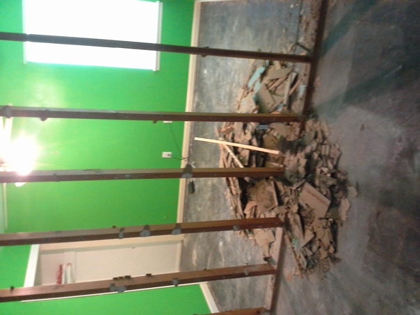 A wall has been demolished down to the studs in the middle of a bright green room with an unfinished floor. |
