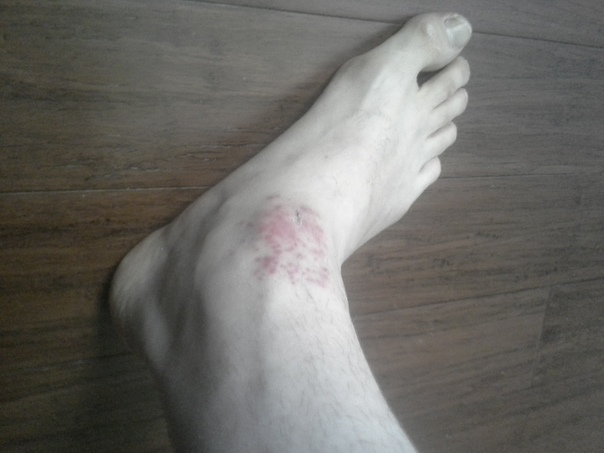A man's foot that has a red rash on the ankle is barefoot on a wooden floor. |