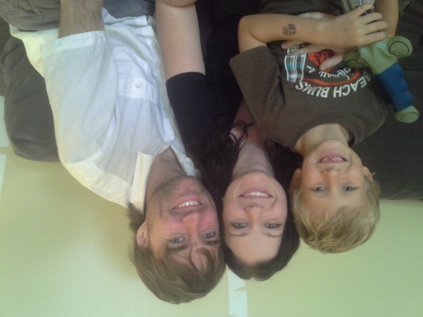 A man, woman and a child holding a foam sword are posing for the camera. |
