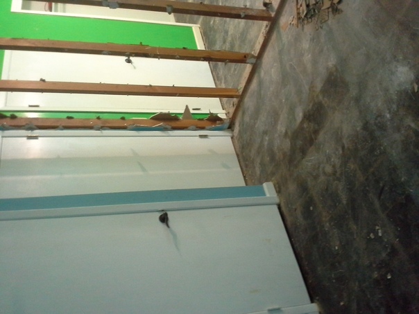 a wall with a block of wood situated in between it and some dry leaves on the wood block. |