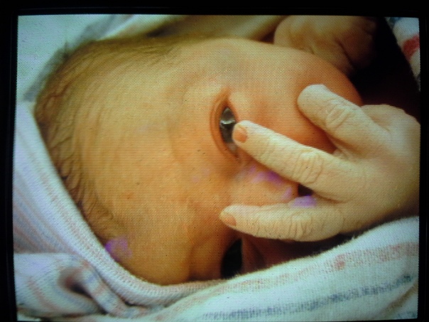 I see a newborn baby wrapped up in a blanket and covering his mouth. |