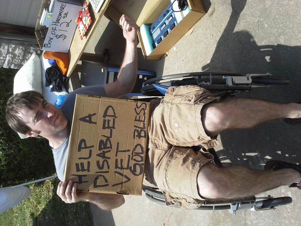 a gentleman is sitting in a wheelchair holding a cardboard sign that reads help a disabled vet god bless |
