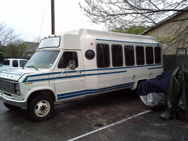 A white and blue older styled van pulled into a parking spot backwards and is parked next to a covered motorcycle. |