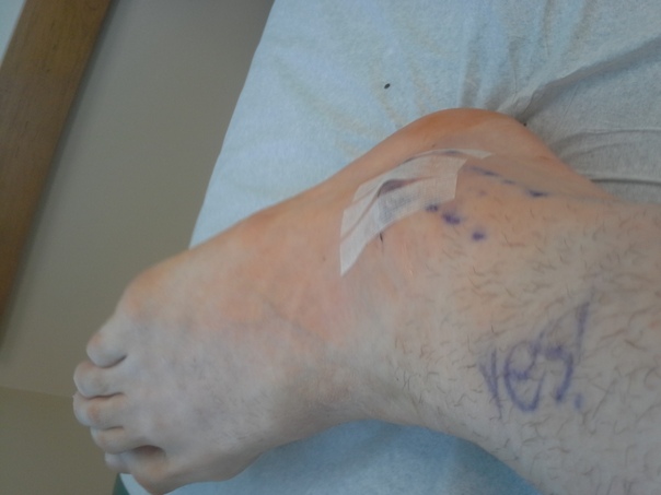 A foot with text "vest" written in blue in the hairy portion |