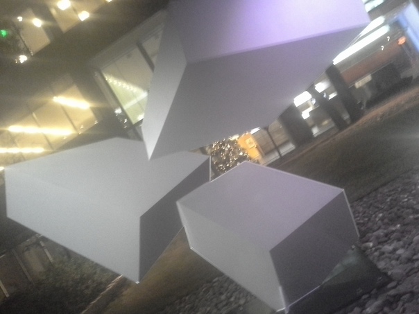 An abstract courtyard sculpture consisting of white rectangular blocks suspended at differing angles. |