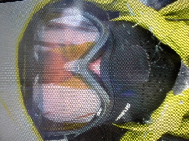 A man with goggles staring with a blank expression while wearing a face mask. |