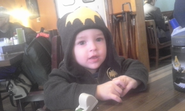 The little boy is sitting at a table that is made of wood and is wearing a shirt that has a bat on it. |
