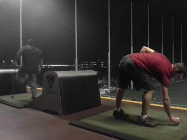 Two men shooting golf balls at a driving range at night. |