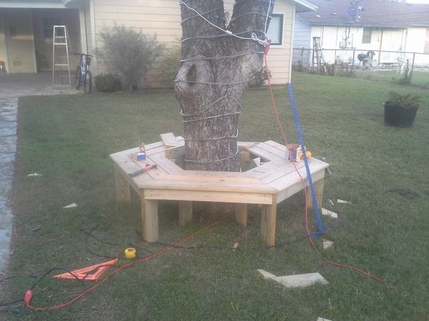 lots of ropes tied around a tree with a bench surrounding the tree in between grass |