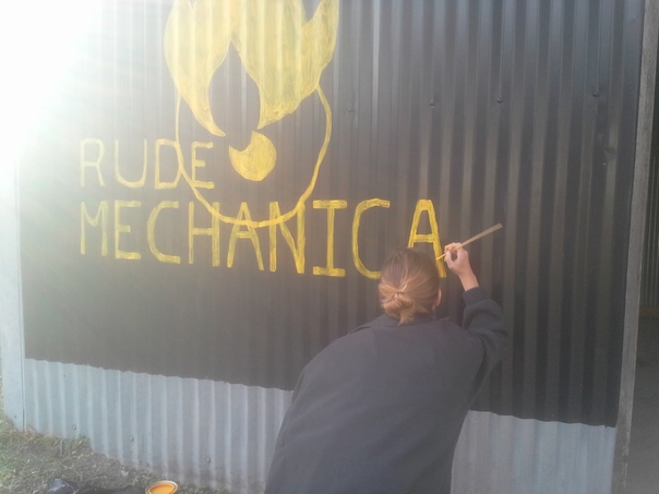 An artist uses yellow paint on a black background to create the company's logo. |