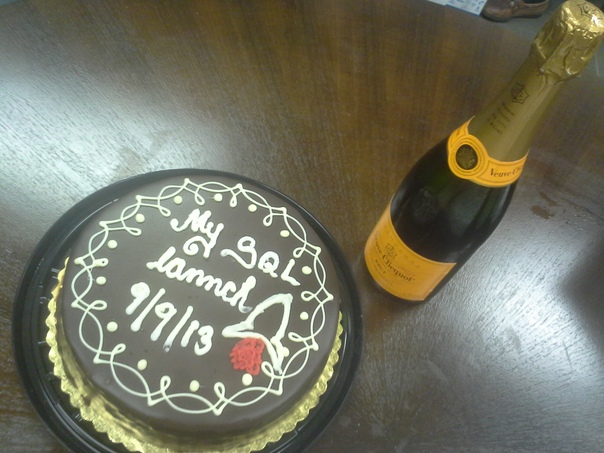 A cake with writing on it sitting next to a bottle of wine. |