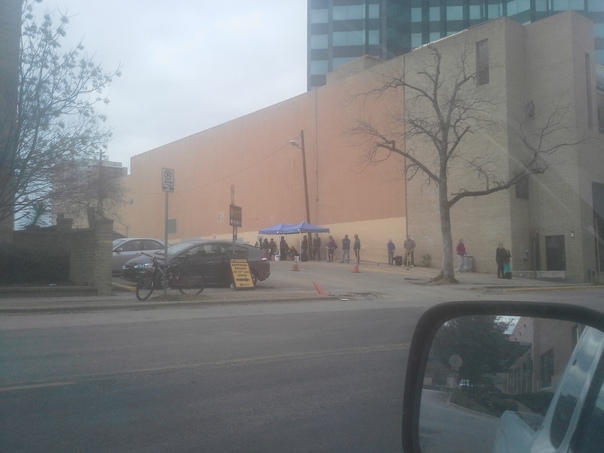 A small line of people are behind a blue tent located next to an industrial looking brick building in a city. |
