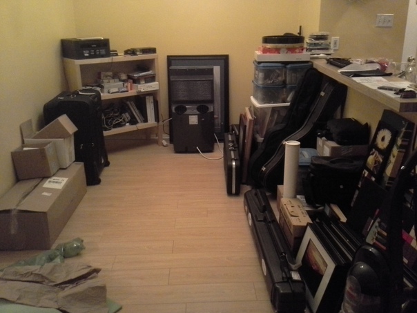The room has light wood flooring and appears to be consumed with various musical instraments and other clutter stuffed on top of every surface. |