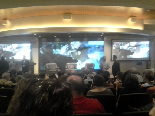 Group of interested professionals watch video of the new Google Glasses demonstration. |