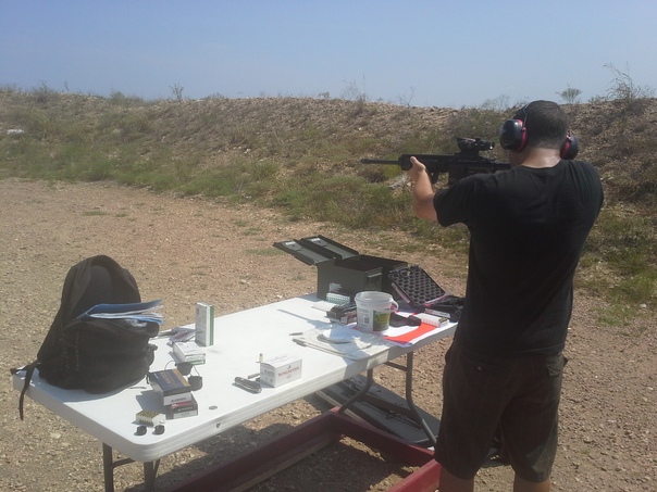 This guy is practicing safe shooting at the rifle range, wearing his ear protectors. |