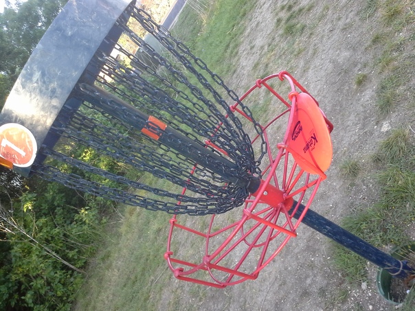 A photo of the first hole on a frisbee golf course with an orange disc in the holding tray. |