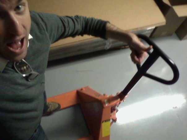 A man holding onto a black steering wheel near a pink piece of metal. |