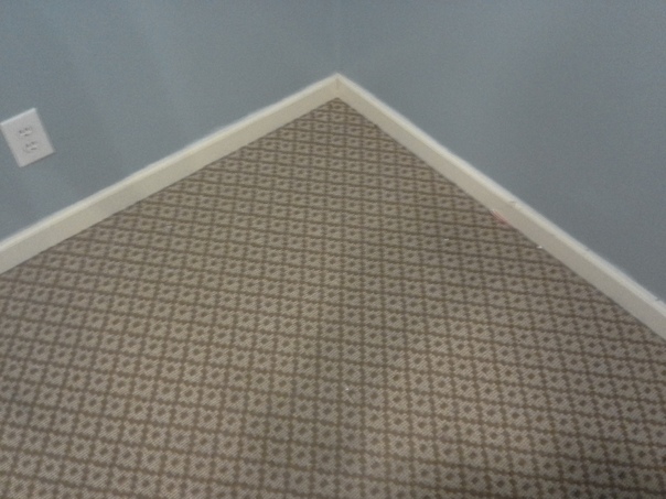 This picture is a floor with a rug and a blue wall |