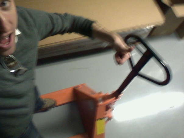 The enthusiastic gesture of a man on a hand truck is captured while he makes a funny facial expression. |