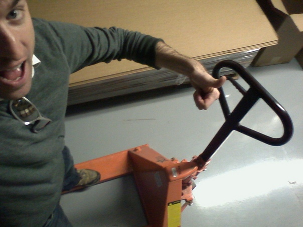 A man with a thumb up riding on an orange and black dollie. |