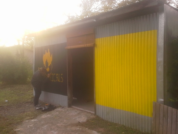 The artwork is painted onto a tin siding of a building, perhaps a small business or even a shed. |