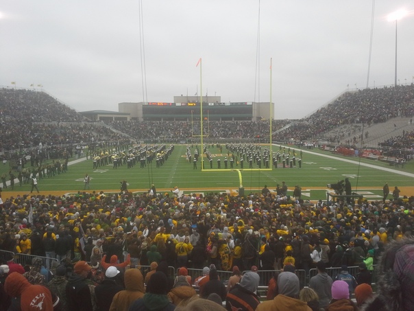 Many spectators are gathered to watch the local marching band at half time. |