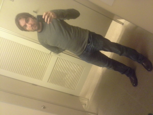 A young Caucasian man weraing blue jeans and a long sleeve shirt talking a selfie in a mirror. |
