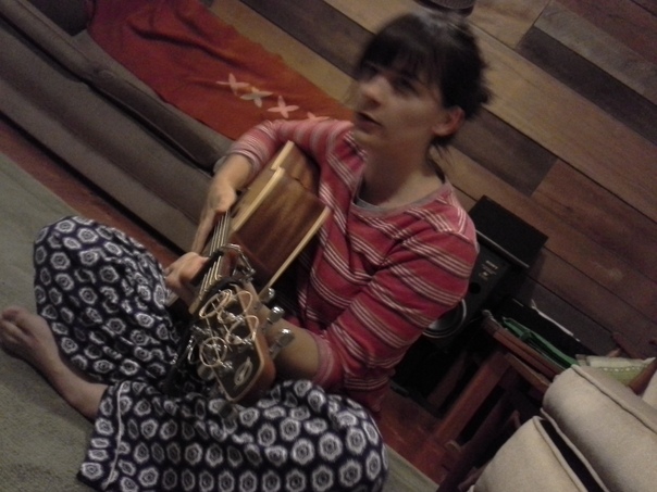 This is a girl with dark brown hair who is wearing pajamas and sitting on the floor playing guitar. |