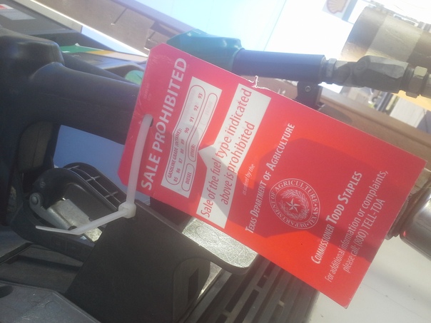 This picture is of a bright red sales prohibited tag on a black gas pump handle. |