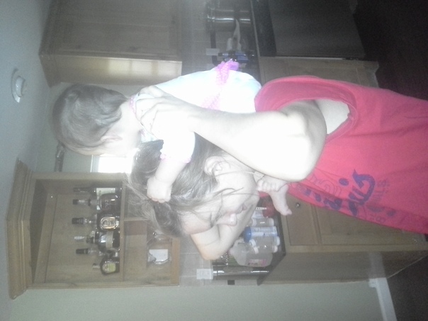 A baby girl sits on the shoulders of an older girl, clutching her hair and gazing at the baby bottles and liquor bottles all resting on the cabinet to her right.