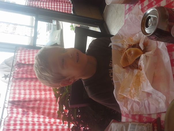 A young boy is eating a messy sandwich inside of a restaurant. |