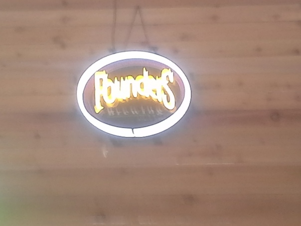 The neon sign appears very blurry in the photo but stil reads "Pounders". |