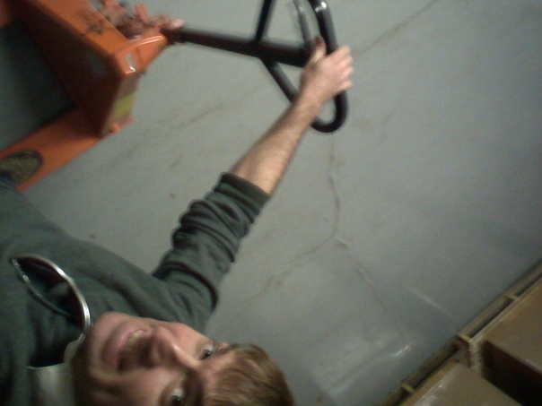 A smiling man wearing sunglasses on his shirt is holding on to a jack at work. |