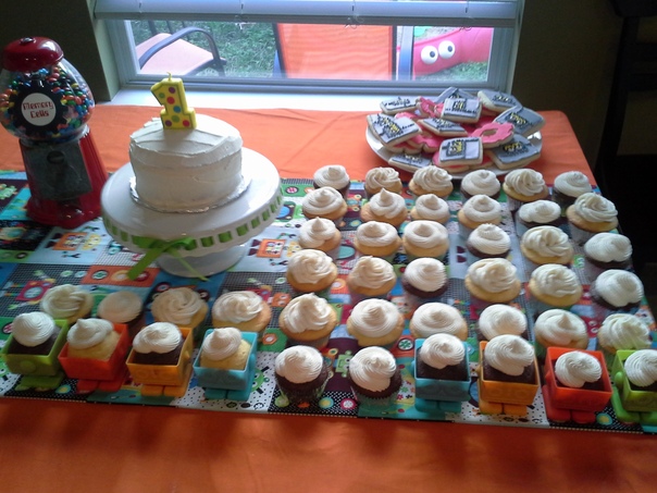Several miniature cupcakes with white frosting on a decorative table. |