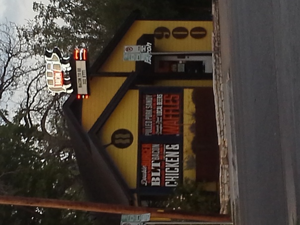 A yellow and black restaurant with a pig shape on the sign and letters describing food items in the window. |