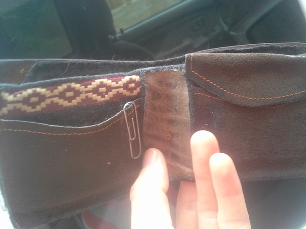 Someone holds an empty wallet containing only a single silver paper clip. |