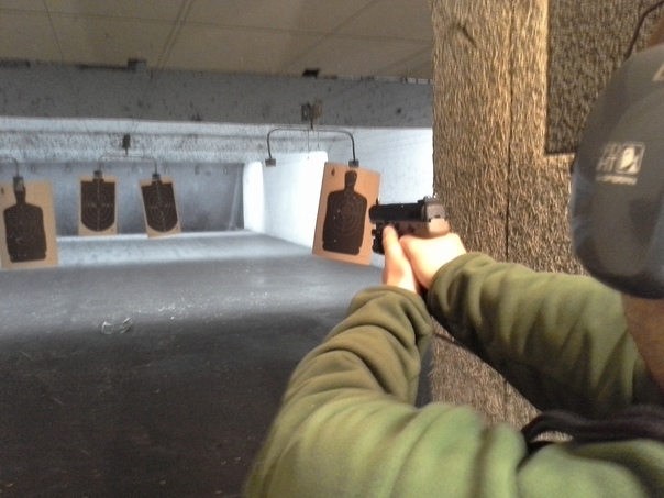 This man in the green sweater aims a semi-automatic pistol at a faraway target. |