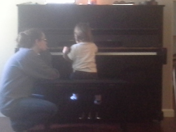 the woman sat her toddler at the piano, maybe she will teach the child to play. |