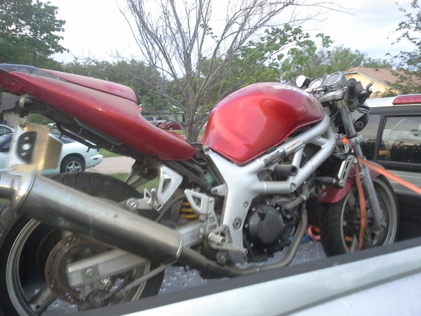 A red motorcycle is secured with ratchet straps in the back of a pick up truck. |