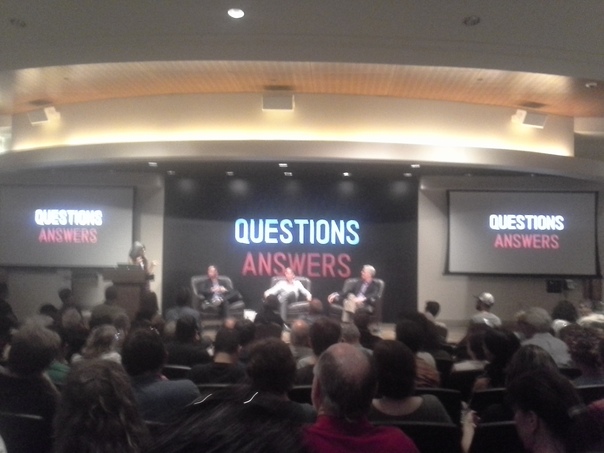 Under screens that say "Questions Answers," three people are sitting in chairs on a stage in front of an audience. |