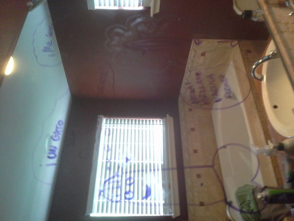 Graphic Spanish graffiti is written on a mirror in a bathroom with dark walls and white bathtub and sink. |