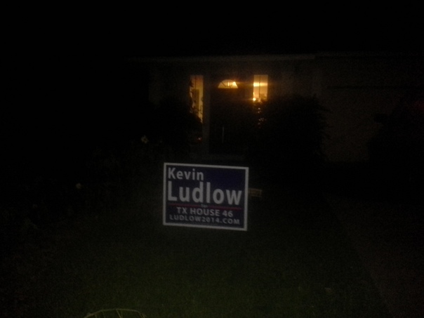 lights shining in window and a sig n in front |