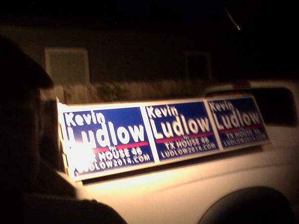 Three blurry signs for Kevin Ludlow, who is running for TX house 46. |