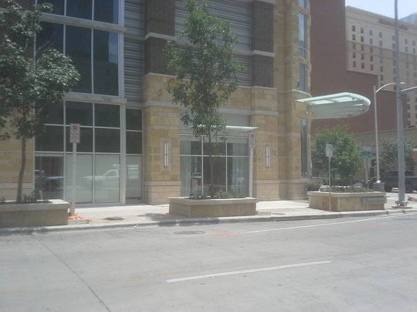 A paved road in front of a multiple story building and a sidewalk. |