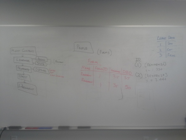 A whiteboard shows various terms and diagrams, including a description of different forms. |