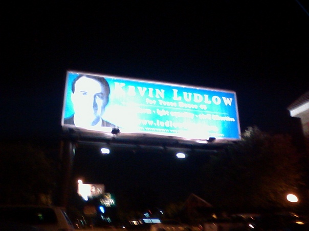 A very large billboard looms over traffic on this busy street. |