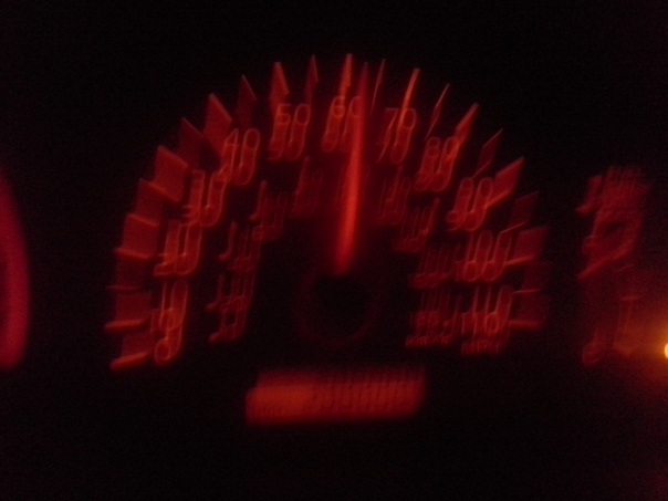 Red dashboard view of a speedometer on a car at night with lights on. |
