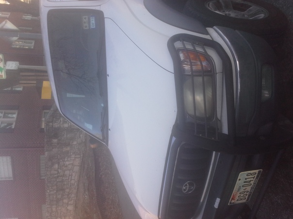 This is the front portion of a white SUV type vehicle that is parked. |