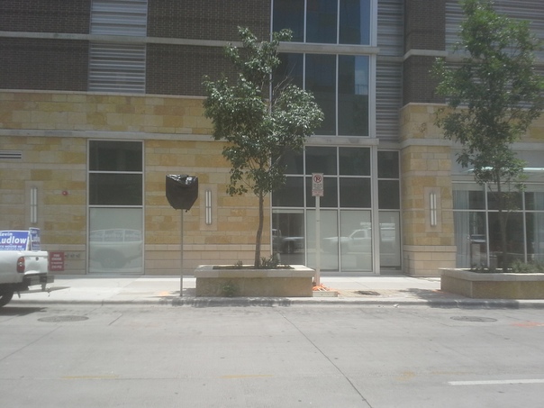 An urban street that has a couple of nice small trees in front of building. |