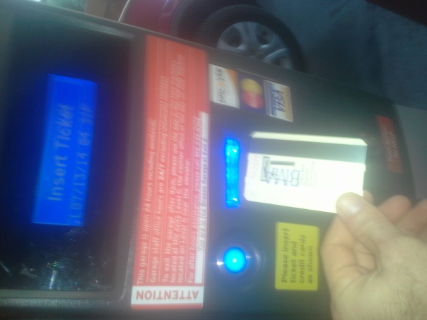 At the parking garage meter, in order to leave, the ticket and money must be entered into the machine. |